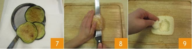 Une fois dorées, cela prendra 1-2 minutes, égouttez les tranches sur du papier absorbant 7. Lorsque vous avez terminé, occupez-vous du pain : coupez les miches en deux avec un couteau à pain 8, mettez de côté le couvercle, puis videz l'intérieur de la base d'une bonne partie de la mie 9.