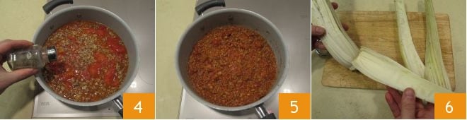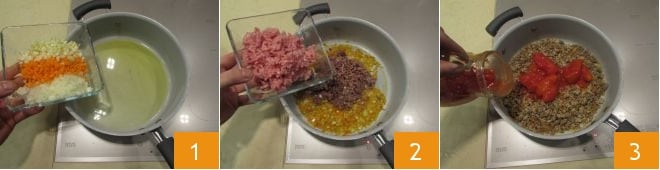 Pour préparer la parmigiana de cardons, commencez par la cuisson de la sauce tomate à la viande. Donc, épluchez et hachez finement au couteau le céleri, la carotte et l'oignon en faisant revenir le tout dans une casserole où vous aurez versé de l'huile d'olive extra vierge 1. Ajoutez ensuite la viande hachée de veau et de porc 2 et faites revenir pendant quelques minutes puis ajoutez également la pulpe de tomate 3.