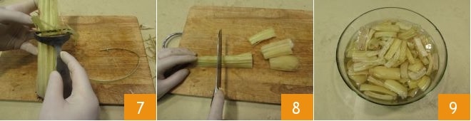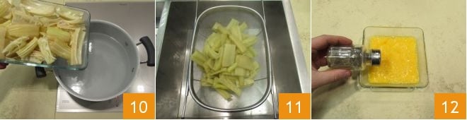 Accédez aux côtes plus internes, qui sont au contraire plus tendres et savoureuses, puis éliminez les filaments à l'aide d'un éplucheur 7 et coupez-les en morceaux de 6-7 cm, ainsi la cuisson sera uniforme 8. Plongez immédiatement les morceaux de cardon dans de l'eau froide acidulée 9, où vous aurez pressé le jus d'un citron, de cette façon ils ne noirciront pas.