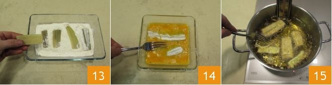 farinez les morceaux de cardon 13 et passez-les immédiatement dans les œufs 14. Faites-les frire quelques-uns à la fois dans une casserole avec de l'huile de friture chaude (vérifiez avec un thermomètre de cuisine qu'elle ne dépasse pas la température de 170-180°) pendant environ 4-5 minutes, ou jusqu'à ce qu'ils aient formé une croûte dorée en surface. 15