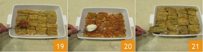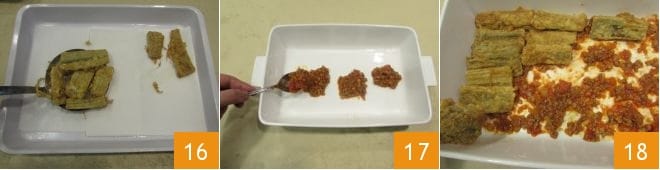 Au fur et à mesure que vous les cuisinez, placez-les sur du papier absorbant pour absorber l'excès d'huile 16. Couvrez le fond d'un plat à gratin 30x20 avec de la sauce 17, en la répartissant uniformément, puis disposez les cardons frits côte à côte 18.