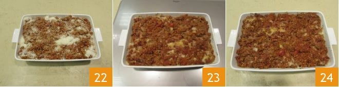 Formez la première couche, ajoutez encore un peu de sauce 19 et saupoudrez de parmesan râpé 20, et continuez ainsi, en alternant les couches de cardons 21 avec la sauce et le fromage jusqu'à épuisement des ingrédients.