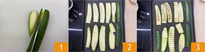 Pour préparer la parmigiana de courgettes grillées, commencez par laver les courgettes, couper les extrémités et bien les sécher. Coupez-les en tranches d'environ 5 mm d'épaisseur dans le sens de la longueur 1. Grillez les courgettes sur une plaque bien chaude 2, en les retournant à mi-cuisson ; la cuisson prendra environ 6 minutes au total 3.