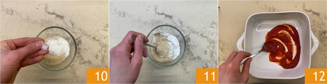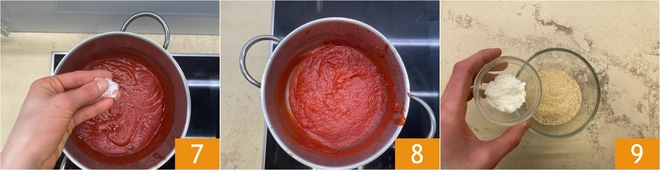 Ajoutez une pincée de sel 10 et mélangez 11. Étalez une fine couche de sauce au fond d'un plat de 19x19 cm 12.