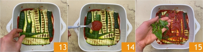 Formez une première couche avec les courgettes grillées 13. Ajoutez un peu de passata de tomate 14 et quelques feuilles de basilic déchirées à la main 15.