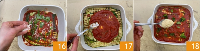 Saupoudrez d'un peu de pecorino 16, puis continuez d'alterner les couches jusqu'à épuisement des ingrédients. Vous obtiendrez au total 3 couches. Terminez par une couche finale de tomate 17 et de basilic. Saupoudrez de la panure préparée précédemment 18.