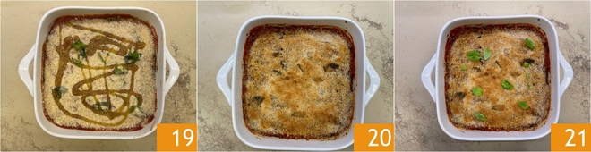 Ajoutez un filet d'huile 19 et faites cuire dans un four statique préchauffé à 180 °C pendant environ 40 minutes, jusqu'à ce qu'une croûte dorée se soit formée 20. Laissez tiédir avant de servir, ainsi la parmigiana sera plus compacte et savoureuse. Ajoutez quelques feuilles de basilic supplémentaires et servez votre parmigiana de courgettes grillées 21 !