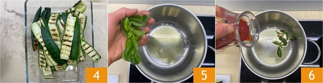 Mettez de côté les courgettes grillées et laissez-les refroidir 4. Pendant ce temps, versez une cuillère à café d'huile dans une poêle, ajoutez la gousse d'ail et quelques feuilles de basilic 5 et faites-les revenir brièvement. Ajoutez ensuite la passata de tomate 6.