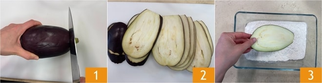 Pour préparer la parmigiana de la mer, commencez par les aubergines : lavez-les et enlevez le pédoncule 1, puis coupez-les finement, environ 4-5 mm d'épaisseur 2. Pendant ce temps, chauffez l'huile de graines dans une grande casserole. Farinez les aubergines 3.