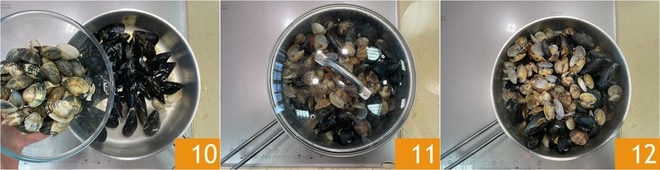 Versez les Comment nettoyer et ouvrir les moules et les palourdes déjà purgées 10. Couvrez avec le couvercle 11 et cuisez à feu vif jusqu'à l'ouverture des coquilles 12.