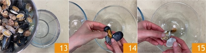 Une fois prêtes, égouttez-les à travers une passoire 13, en prenant soin de conserver le jus de cuisson 13. Décortiquez les moules 14 et les palourdes 15.