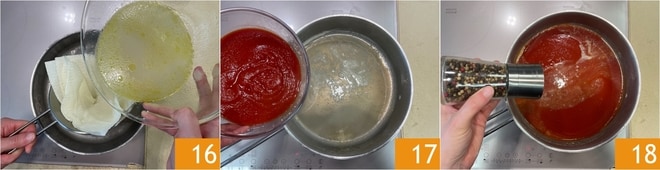 Filtrez le jus de cuisson des moules et des palourdes et recueillez-le dans une poêle 16, puis portez-le à ébullition et ajoutez la sauce tomate 17, salez et poivrez 18. Cuisez pendant 20 minutes sans couvercle.