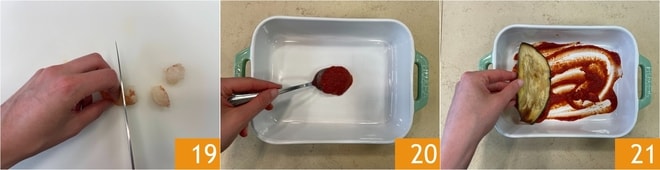 Prenez les crevettes nettoyées et coupez-les en morceaux 19. Tout est prêt pour composer la parmigiana : prenez un plat allant au four de 25x18 cm, répartissez au fond une première couche de sauce 20, puis déposez les aubergines frites 21 et recouvrez à nouveau avec la sauce tomate.