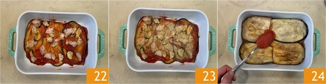 Poursuivez avec une couche de moules, palourdes et crevettes 22, puis saupoudrez de chapelure aux herbes 23. Continuez avec une autre couche d'aubergines et de sauce 24 et alternez les couches de la même manière jusqu'à épuisement des ingrédients.