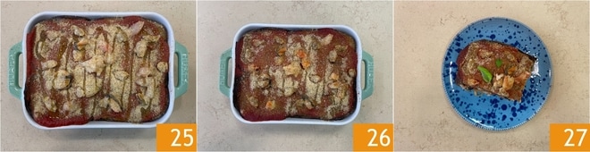 Terminez la dernière couche avec la chapelure et un filet d'huile d'olive 25. Faites cuire dans un four statique préchauffé à 180° pendant 25 minutes. Sortez votre parmigiana de la mer du four, laissez-la tiédir légèrement, puis servez-la en parfumant le plat avec des feuilles de basilic frais 27 !