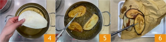 Lorsque l'huile atteint 170°, plongez les tranches d'aubergines farinées 4. Faites frire quelques minutes jusqu'à ce qu'elles soient dorées 5, puis égouttez-les sur un plateau recouvert de papier absorbant 6.