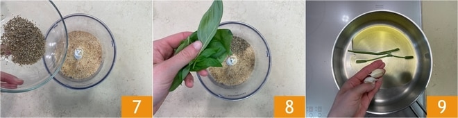 Maintenant, préparez la chapelure aux herbes : dans le mixeur, versez la chapelure, l'origan 7 et les feuilles de basilic 8. Mixez le tout et gardez de côté. Passez aux mollusques : dans une poêle, chauffez l'huile avec l'ail et les tiges de persil 9. Laissez infuser quelques instants.