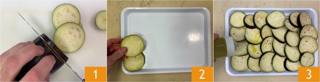 Pour préparer la parmigiana d'aubergines à la friteuse à air, commencez par couper les aubergines en rondelles d'environ 1 cm d'épaisseur 1. Disposez les tranches sur un plateau 2 et arrosez-les d'un filet d'huile 3.