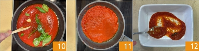Salez, poivrez et faites cuire à feu moyen pendant environ 20 minutes, en remuant de temps en temps 10. Quand la sauce tomate est prête 11 et les aubergines cuites, vous pouvez assembler votre parmigiana : prenez un plat de 20x15 cm et recouvrez le fond avec un peu de sauce 12.