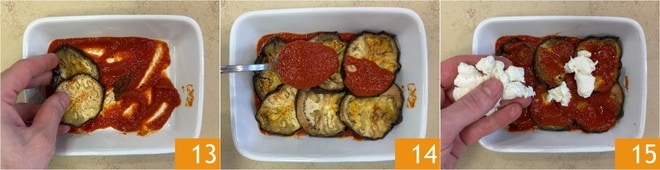 Disposez les tranches d'aubergine en les chevauchant légèrement 13, puis recouvrez de sauce généreusement 14 et répartissez la mozzarella en morceaux 15.