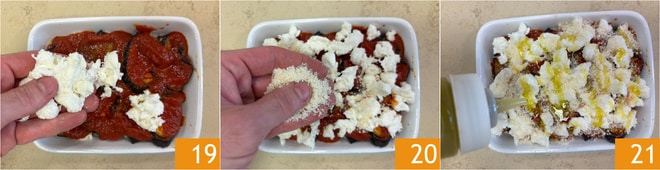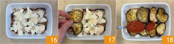 Parsemez de Parmigiano Reggiano râpé 16 et continuez en répétant les couches dans le même ordre : d'abord les aubergines 17 et la sauce tomate 18.