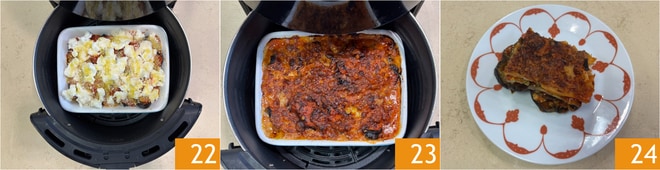 Transférez le plat dans le panier de la friteuse et faites cuire pendant 15 minutes à 190° 22. Une fois cuite 23, laissez reposer la parmigiana à la friteuse à air pendant quelques minutes avant de la couper et de la servir 24 !