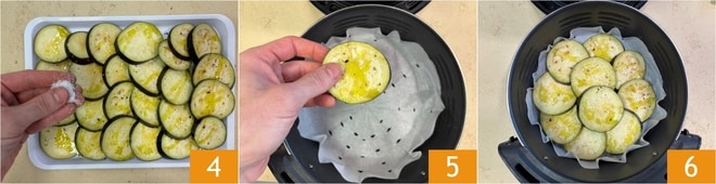 Ajoutez également le sel 4 et le poivre, puis transférez les aubergines dans le panier de la friteuse à air (nous avons utilisé une friteuse d'une capacité de 6 litres) 5. Faites cuire à 200° pendant 8 minutes 6.