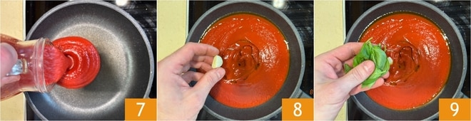 Entre-temps, préparez la sauce tomate : versez la purée de tomates dans une poêle 7, puis assaisonnez avec un filet d'huile, une gousse d'ail 8 et quelques feuilles de basilic 9.
