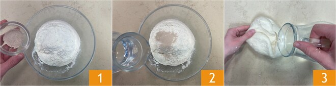 Pour préparer la pasqualina facile aux asperges, commencez par vous occuper de la pâte : dans un bol, mélangez la farine 00 et la manitoba, puis ajoutez la levure 1 et presque toute l'eau 2. Travaillez à la main jusqu'à ce que la pâte commence à se former, puis passez sur le plan de travail et ajoutez le reste de l'eau petit à petit en continuant à pétrir 3.