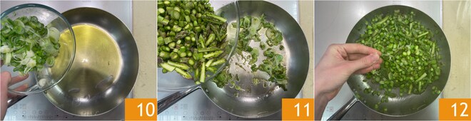 Dans une poêle, versez l'huile, ajoutez les oignons nouveaux 10 et faites-les dorer, à feu moyen, pendant 5 minutes, puis ajoutez les asperges 11. Assaisonnez de sel 12 et faites cuire à feu moyen-élevé pendant environ 10 minutes.