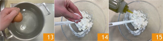 En attendant, faites bouillir les œufs pendant 7 minutes 13. Dans un bol, mettez la ricotta et assouplissez-la avec une cuillère, salez 14 et poivrez, puis versez l'huile 15.