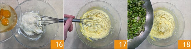 Ajoutez le parmesan râpé et les œufs 16 et mélangez jusqu'à obtenir un mélange homogène 17. Enfin, ajoutez les oignons nouveaux et les asperges 18, mélangez à nouveau et réservez.