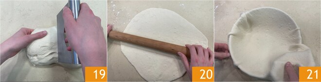 Après le temps de levée, reprenez la pâte et divisez-la en 2 parties, une d'environ 500 g et l'autre de 300 g 19. Étalez la partie la plus grande 20 jusqu'à obtenir une feuille de 5 mm d'épaisseur. Recouvrez un moule de 25 cm de diamètre, préalablement huilé, en laissant dépasser largement la pâte des bords 21.