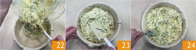 Versez la garniture dans le moule 22 et égalisez la surface 23, puis créez 7 cavités avec le dos d'une cuillère 24.