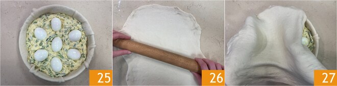Placez les œufs durs dans les cavités 25. Étalez la deuxième boule de pâte 26 et recouvrez le moule 27.