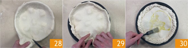 Coupez l'excès de pâte 28 et repliez les bords pour les sceller et former un cordon 29. Badigeonnez la surface d'huile 30.