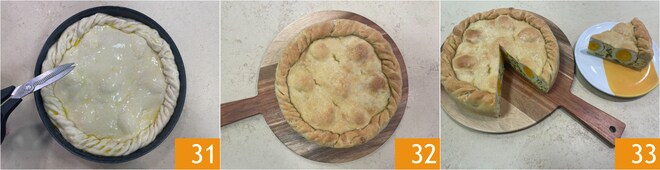 Enfin, faites 4 entailles avec des ciseaux 31 ; de cette manière, la vapeur qui se dégagera pendant la cuisson pourra s'échapper et empêchera la surface de la tarte de gonfler. Faites cuire au four statique à 180° pendant une heure sur la grille intermédiaire, puis placez la tarte sur la grille la plus basse, sans qu'elle soit en contact direct avec la base du four, et poursuivez la cuisson pendant encore 15 minutes. Une fois le temps de cuisson écoulé, sortez du four et laissez tiédir 32. Votre pasqualina facile aux asperges est prête à être dégustée 33 !