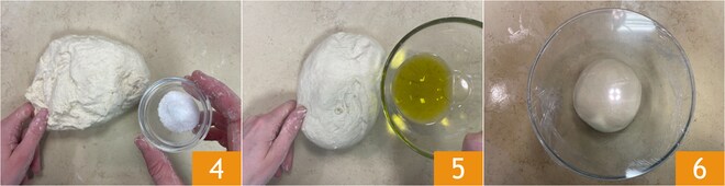 Une fois que toute l'eau est absorbée, ajoutez le sel 4 et pétrissez pendant environ 5 minutes. Ajoutez également l'huile, petit à petit, en continuant à travailler pour qu'elle soit complètement absorbée 5. Lorsque la pâte est lisse et homogène, transférez-la dans un bol et couvrez-la de film plastique 6. Laissez lever à température ambiante pendant environ une heure.