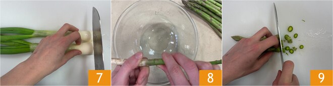 Passez à la garniture : coupez finement les oignons nouveaux 7 et réservez. Maintenant, occupez-vous de la Comment nettoyer les asperges : éliminez la partie la plus dure et ligneuse 8, puis coupez la tige en rondelles 9 et divisez les pointes en deux dans le sens de la longueur.