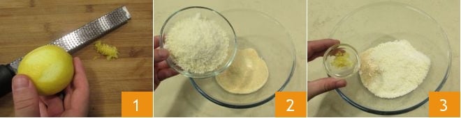 Pour préparer les passatelli avec ragoût de pommes, commencez par mettre sur le feu un bon Bouillon de viande (vous pouvez aussi réaliser un bouillon végétal si vous préférez, vous obtiendrez un goût plus délicat). Pendant qu'il cuit, consacrez-vous à la pâte des passatelli : râpez le zeste de citron 1, en prenant soin de ne pas prélever la partie blanche qui est amère, et mettez-le de côté. Dans un récipient, versez la chapelure et le Parmesan râpé 2, ajoutez également le zeste de citron 3,