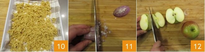 Au fur et à mesure que vous les formez, placez-les sur un petit plateau recouvert d'un torchon légèrement fariné 10. Mettez de côté les passatelli et occupez-vous du ragoût de pommes : nettoyez et hachez une échalote 11, lavez et séchez les pommes, puis coupez-les en quartiers 12
