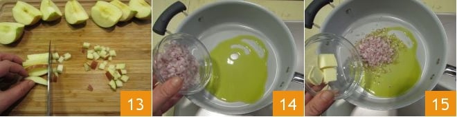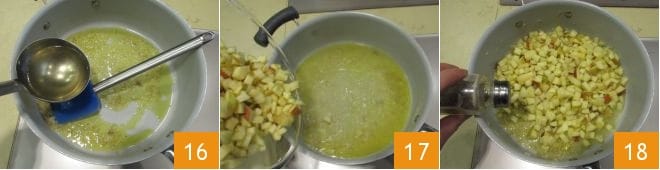 Faites fondre l'échalote à feu doux pendant 4-5 minutes puis allongez avec une louche de bouillon 16, versez les pommes en dés 17, salez, poivrez 18 et faites cuire pendant 10 minutes à feu doux.
