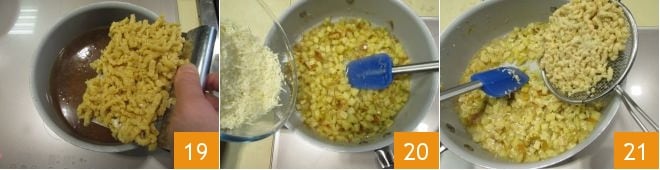 Entre-temps, portez à ébullition le bouillon de viande et versez-y les passatelli 19 faites-les cuire jusqu'à ce qu'ils remontent à la surface, cela prendra quelques minutes. Pendant ce temps, le ragoût sera prêt, éteignez le feu et assaisonnez avec la moitié de la dose de fromage de Fossa râpé 20. Égouttez les passatelli avec une écumoire directement dans la casserole avec le ragoût de pommes 21.