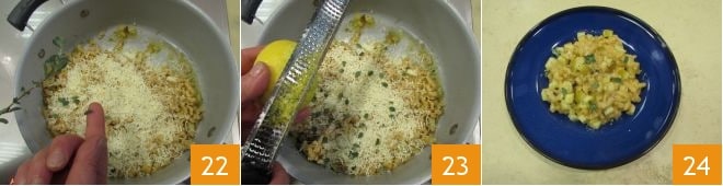 Assaisonnez encore avec le fromage de Fossa restant, les feuilles de marjolaine 22 et le zeste râpé de citron 23 et servez bien chaud les passatelli avec ragoût de pommes 24.