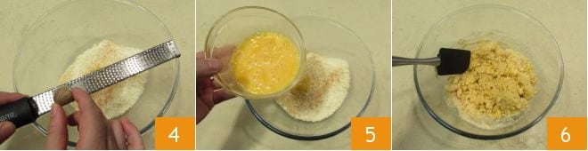 aromatisez avec la muscade râpée 4 et enfin versez les œufs battus avec une pincée de sel 5. Mélangez les ingrédients en vous aidant d'une spatule 6, ou à la main si vous préférez,
