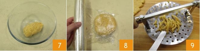 et travaillez jusqu'à obtenir une pâte élastique et compacte 7. Si elle devait s'avérer trop sèche, ajoutez un peu de bouillon, sinon, si elle était trop molle, un peu plus de chapelure. Enveloppez la pâte dans un film plastique et laissez-la reposer au moins 2 heures à température ambiante 8. Cela servira à rendre le composé plus compact et à éviter que les passatelli ne se désagrègent à la cuisson. Après ce temps, retirez le film de la pâte et placez-la sur la planche légèrement farinée, saupoudrez également la surface d'un peu de farine et puis formez les passatelli en vous aidant de l'outil typique. Pour les obtenir, vous devrez presser et tirer en même temps, de cette manière la pâte allongée sortira des petits trous. Ensuite, détachez-les en vous aidant d'une lame et coupez-les à 4 cm de longueur 9.