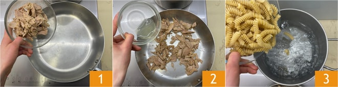 Pour préparer les pâtes au thon en blanc, commencez par mettre le thon bien égoutté dans une poêle 1, chauffez-le pendant quelques minutes à feu doux, et ajoutez le jus de citron 2. Faites cuire les pâtes dans une grande quantité d'eau bouillante salée 3.