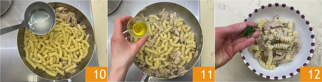 Si la sauce n'est pas assez crémeuse, ajoutez une louche d'eau de cuisson des pâtes 10 et mélangez. Éteignez le feu, ajoutez l'huile 11 et mélangez. Servez et complétez avec du persil haché 12.