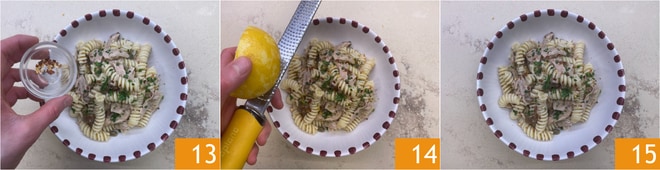 Complétez avec du piment sec 13 et le zeste de citron 14. Vos pâtes au thon en blanc sont prêtes à être dégustées 15.