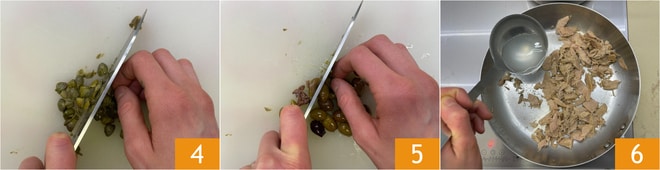 Pendant ce temps, hachez les câpres 4 et les olives 5. Ajoutez une louche d'eau de cuisson des pâtes dans la poêle 6.